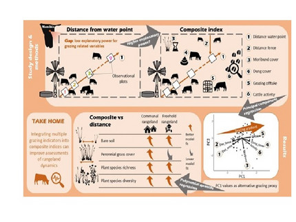 Graphical summary showing how composite grazing indices integrate multiple indicators of cattle activity to quantify grazing pressure at fine spatial scales in semi-arid rangelands. The indices combine long- and short-term grazing metrics (e.g., distance measures, grazing offtake) to capture spatial variability more accurately than the common 'distance from water point' metric. The variables were combined into indices by using principal component regression. The explanatory power of the new grazing proxies for grazing sensitive variables, like bare soil, were tested via polynomial quantile regression. The illustration highlights the improved ability of the indices to explain vegetation responses in the two dominant Namibian rangeland tenure systems.