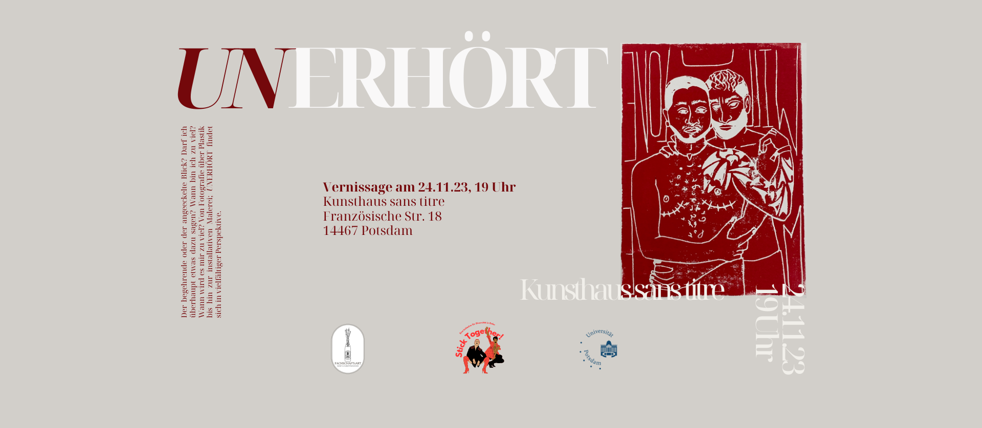 Im Kontext der seit dem Sommer 2023 laufenden Initiative Stick Together! haben Studierende der Fachschaft Kunst und Kunstpädagogik eine Ausstellung erarbeitet. Die Ausstellung lief vom 24.11. - 10.12.2023 im Kunsthaus sans titre, Potsdam sowie vom 17.05. - 29.07.2024 im Landesinstitut für Schule Medien Brandenburg, Ludwigsfelde (ehemals LISUM).
