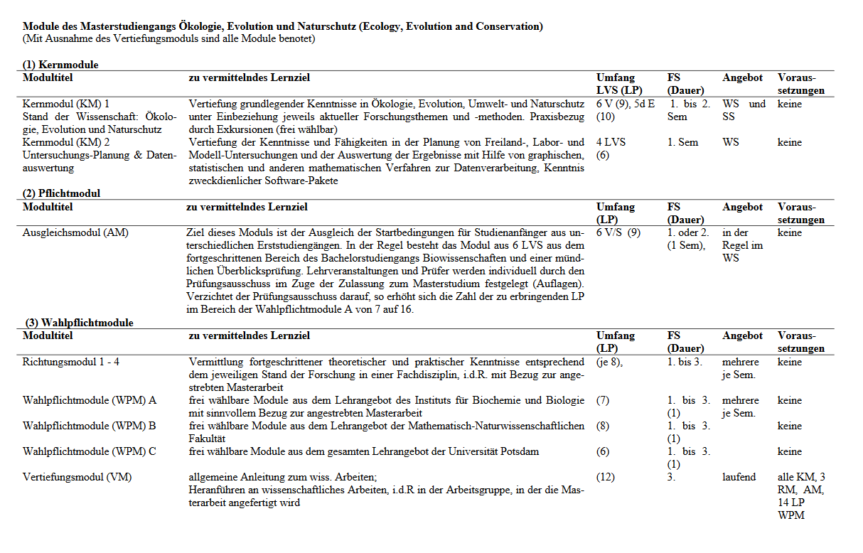 The complete module catalogue for the master's programm Ökologie, Evolution und Naturschutz can be found here.