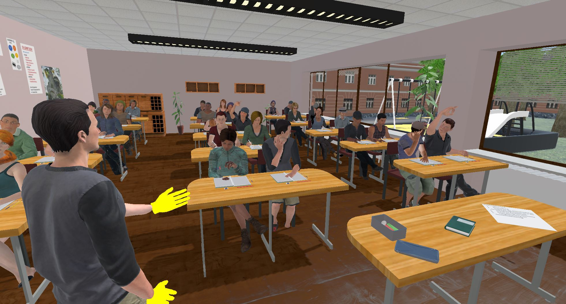 The training of classroom leadership skills is often accompanied by high organisational effort and ethical concerns for pupils and student teachers. For this reason, the chairs "Complex Multimedia Application Architectures" and "Educational Research" of the University of Potsdam have cooperated to create a virtual training environment that addresses this problem. Here, student teachers often take on the role of a teacher for the first time and stand in front of up to 30 virtual students in a realistic classroom. The VR classroom follows a peer training approach: