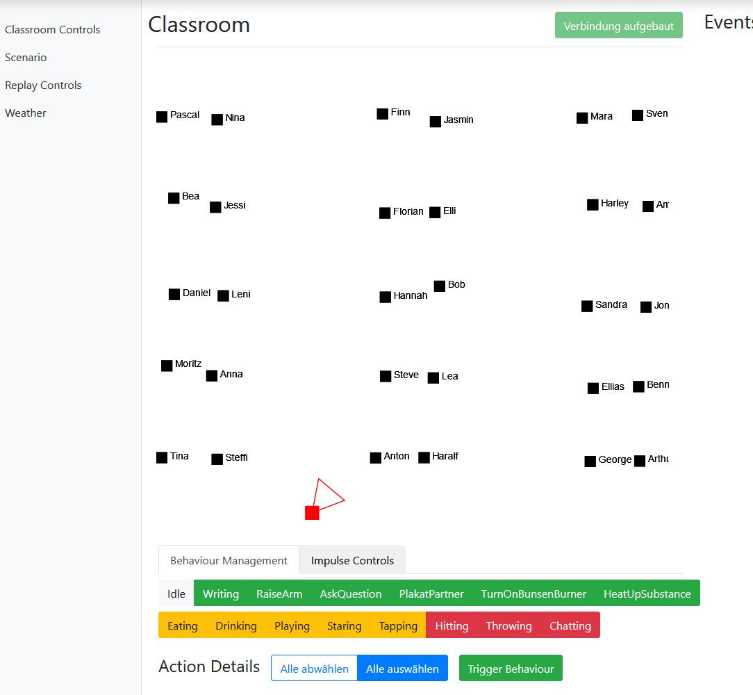 The virtual students can be controlled via a web interface by a peer or the lecturer. This provides personal support in a safe environment for the teacher students under head mounted displays. The fellow students and lecturers themselves have an insight into the perception of the student teachers and can give feedback on concrete situations, provide video recordings for reflection and create specific exercise situations.