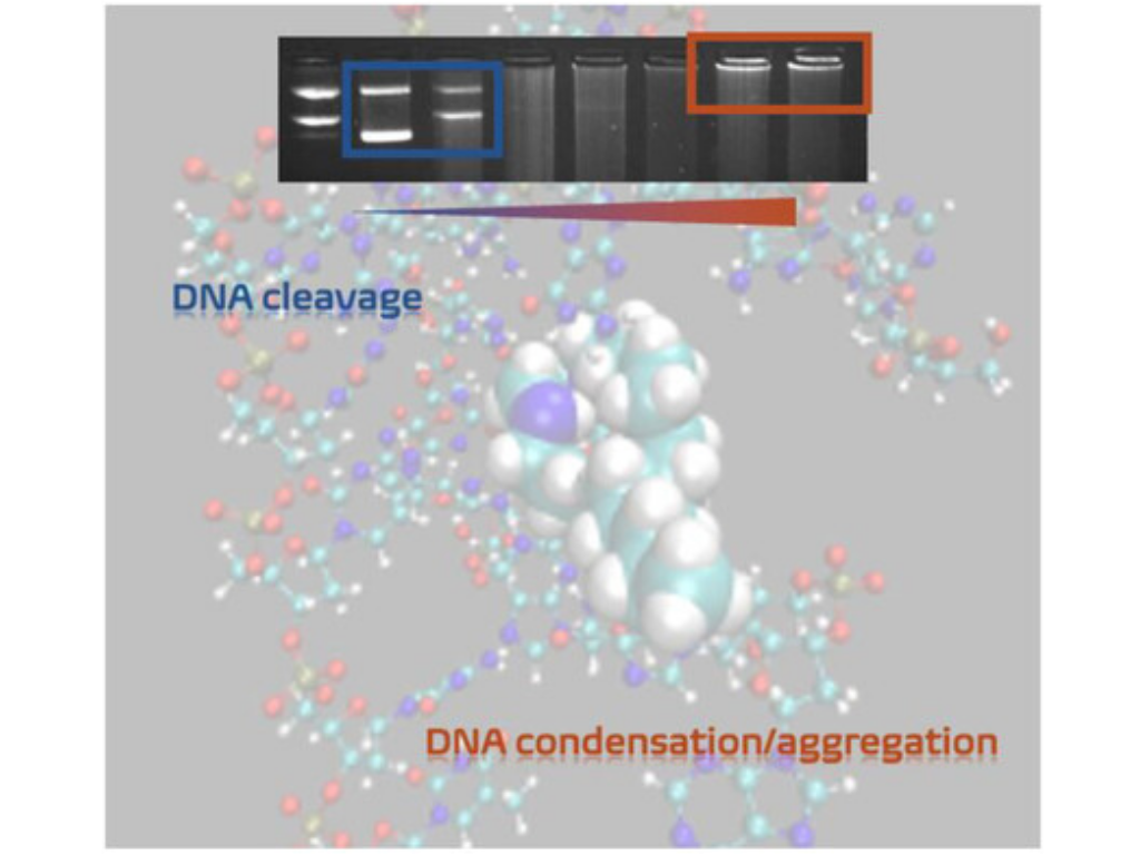 Cu(II) complexes with monoalkylated oxacyclen ligands (C12, C16, and C18) have been investigated regarding their interaction with DNA by different methods: circular dichroism, UV/VIS (ultraviolet-visible) and fluorescence spectroscopy as well as by gel electrophoresis. The results demonstrate that the complexes can cleave DNA through both hydrolytic and oxidative mechanisms, with hydroxyl radicals and hydrogen peroxide identified as the reactive oxygen species involved. The targeted incorporation of alkyl chains significantly enhances the DNA-binding affinity of the Cu(II) complexes, and the length of the alkyl substituents plays an important role, as they can interact with the major groove of the DNA. Alkylation is the determining structural factor responsible for the enhanced DNA interaction, since such an interaction is not observed with unsubstituted complexes. Moreover, the length of the alkyl chains significantly influences this behavior, as longer substituents induce a concentration-dependent DNA aggregation, a phenomenon absent in the nonalkylated analog. This aggregation and condensation behavior is examined using atomic force microscopy and dynamic light scattering. Moreover, DNA/small molecule interactions are also investigated using molecular dynamics simulations.