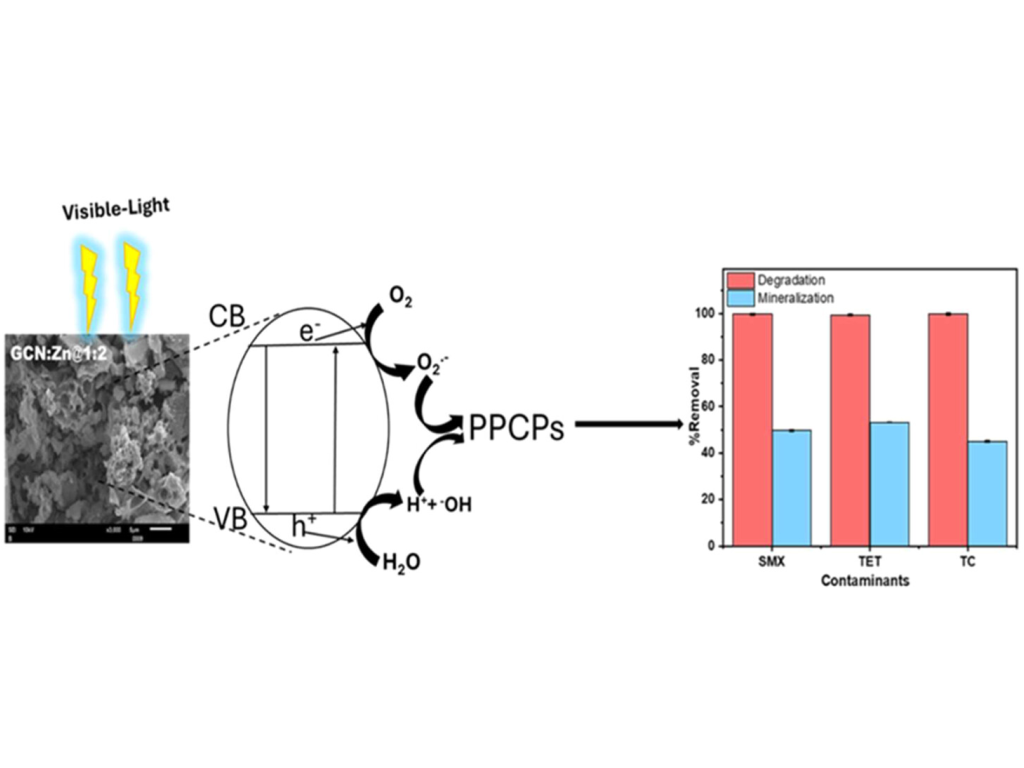 In this study, photocatalytically active graphitic carbon nitride (GCN) photocatalysts with varying amounts of zinc salts were synthesized using a solvent-free, scalable, and eco-friendly method. The photocatalysts were characterized using X-ray powder diffraction, scanning electron microscopy, nitrogen sorption, thermogravimetric analysis, UV–vis diffuse reflectance, and time-resolved photoluminescence (TRPL) spectroscopy. The addition of zinc to the GCN yields materials (GCN:Zn) with an enhanced surface area up to ca. 150 m2/g. Moreover, Zn incorporation affects the electronic structure of GCN and improves the electron transfer rate in the materials. The GCN:Zn materials show significantly improved photocatalytic activity for the degradation of pharmaceutical and personal care products (PPCPs) such as sulfamethoxazole (SMX), tetracycline (TET), and triclosan (TC) compared to zinc-free GCN. Although the degradation efficiency exceeds 98%, mineralization of the PPCPs is moderate (45–53%) due to the formation of stable intermediates. The treated effluents are nontoxic to Escherichia coli and Staphylococcus xylosus, indicating that no harmful intermediates form during the photocatalytic degradation of the PPCPs. The GCN:Zn photocatalysts demonstrate excellent reusability and stability for the degradation of PPCP over four cycles with minimal loss in activity, showcasing their potential for sustainable water treatment applications.