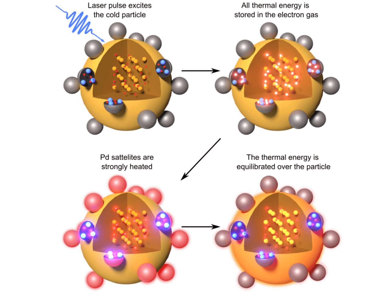 In addition to enhanced fields and possible charge transfer, the concentration of photothermal energy at the nanoscale is a central feature of plasmon-driven photochemistry. It is well known that light energy can be efficiently concentrated in metal nanoparticles to length scales far below the wavelength of light. Here we demonstrate that the energy absorbed by a gold nanoparticle can be further localized within a bimetallic gold-paladium nanoparticle system by the dissipation of energy into the attached palladium satellite nanoparticles. After pulsed excitation of the gold core, the satellites collect nearly all photothermal energy and heat up by 180 K while the light-absorbing gold core remains much colder. By comparing transient absorption dynamics of a series of bimetallic nanoparticles with a three-temperature model, we can precisely assess the temperatures of the electronic and vibrational subsystems. We find a strong inverted temperature gradient that opposes the direction of energy input and concentrates the light energy at the active catalytic nanosite.