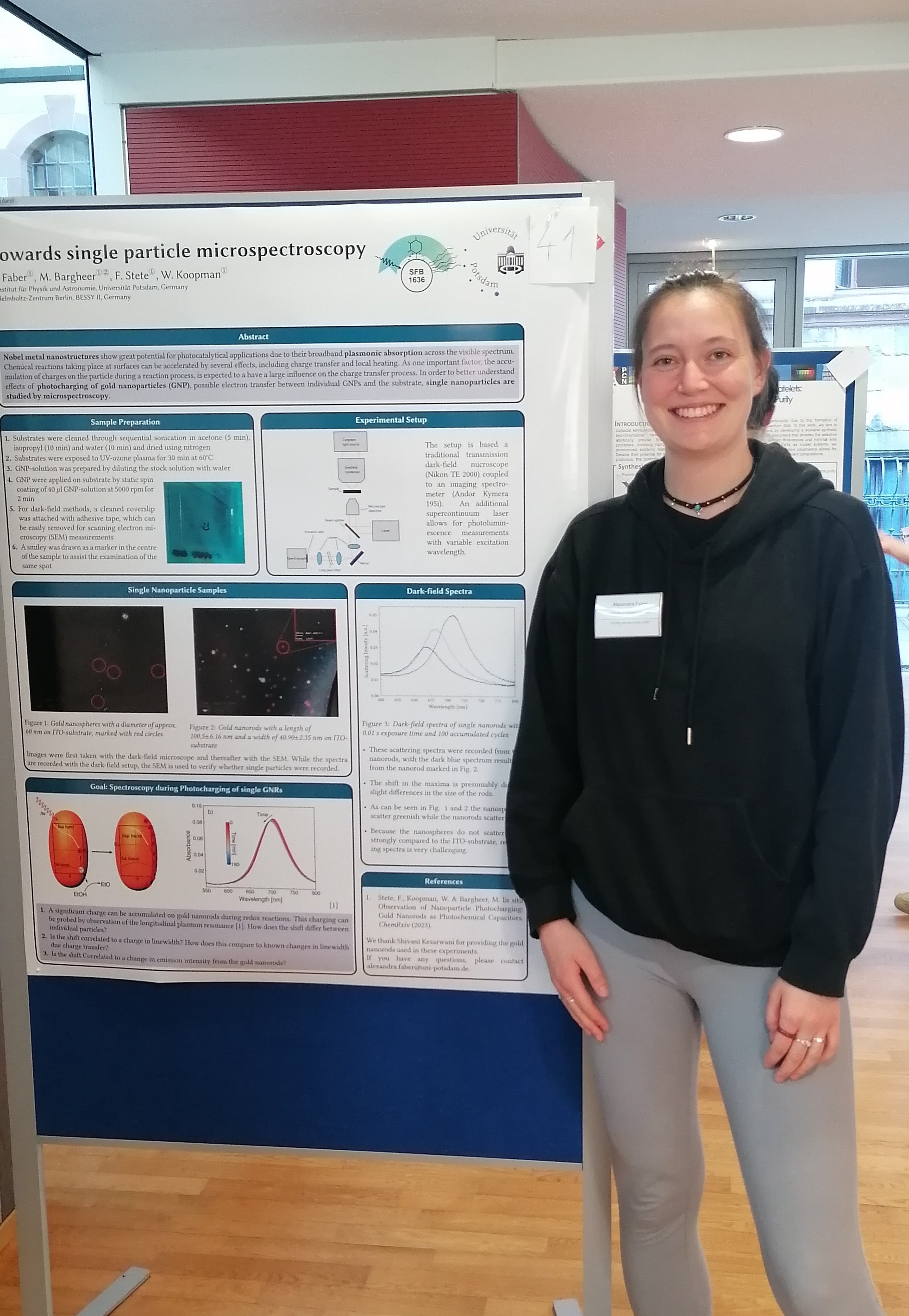 Alexandra's research employs dark-field micro-spectroscopy to study the fundamental properties of single plasmonic nanoparticles in a reactive environment. Building upon recent work showing that gold nanoparticles acquire a significant electric charge during light-induced redox processes, her current goal is to correlate this particle charging mechanism directly to the geometry of individual gold nanorods.