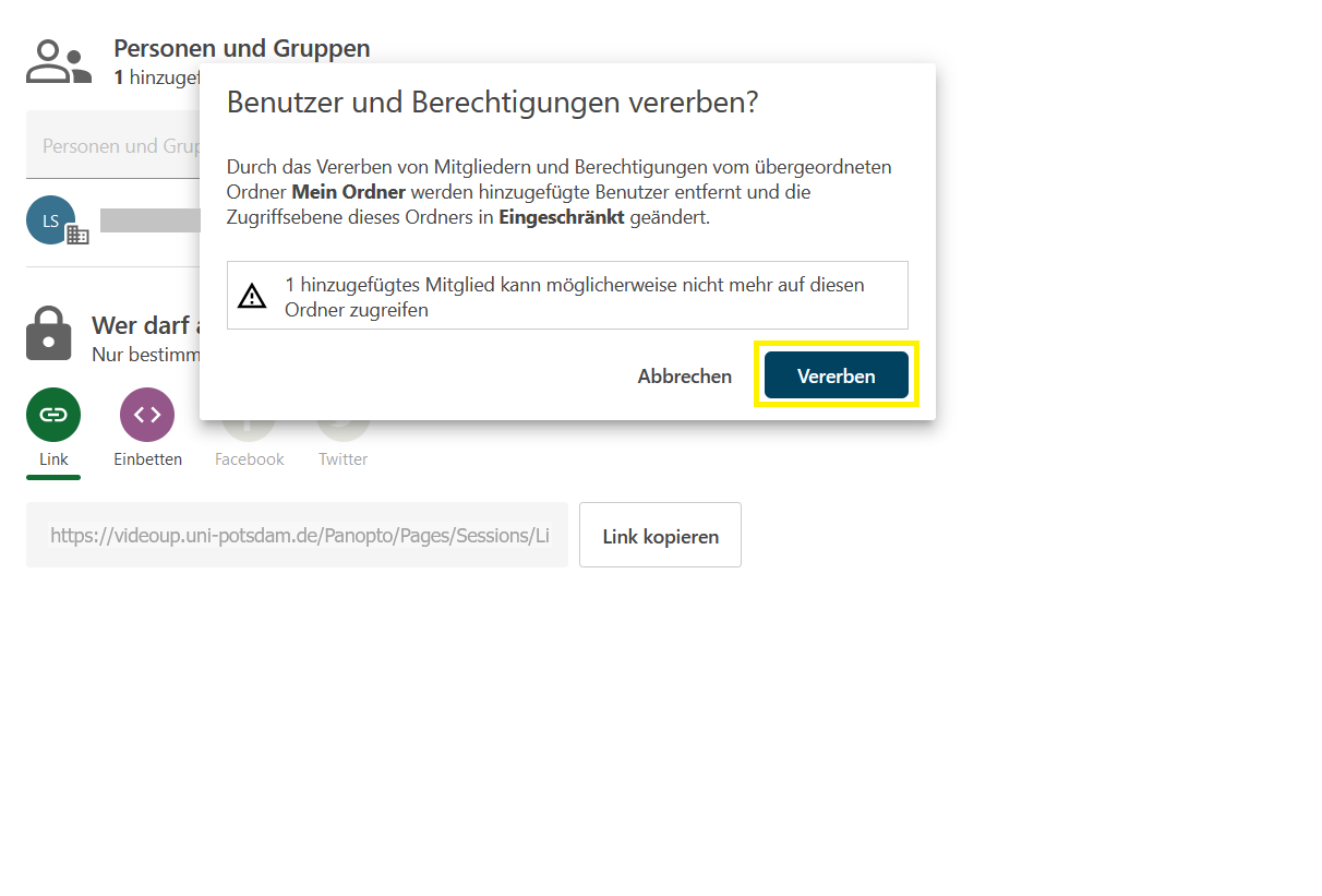 Die Steuerung der Zugriffsberechtigungen Ihrer Videos können Sie auf der Seite Freigeben und Teilen von Videos nachlesen. Informationen zur Freigabe von Ordnern finden Sie auf diese Seite unter dem Abschnitt Freigabe.
