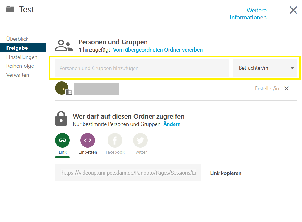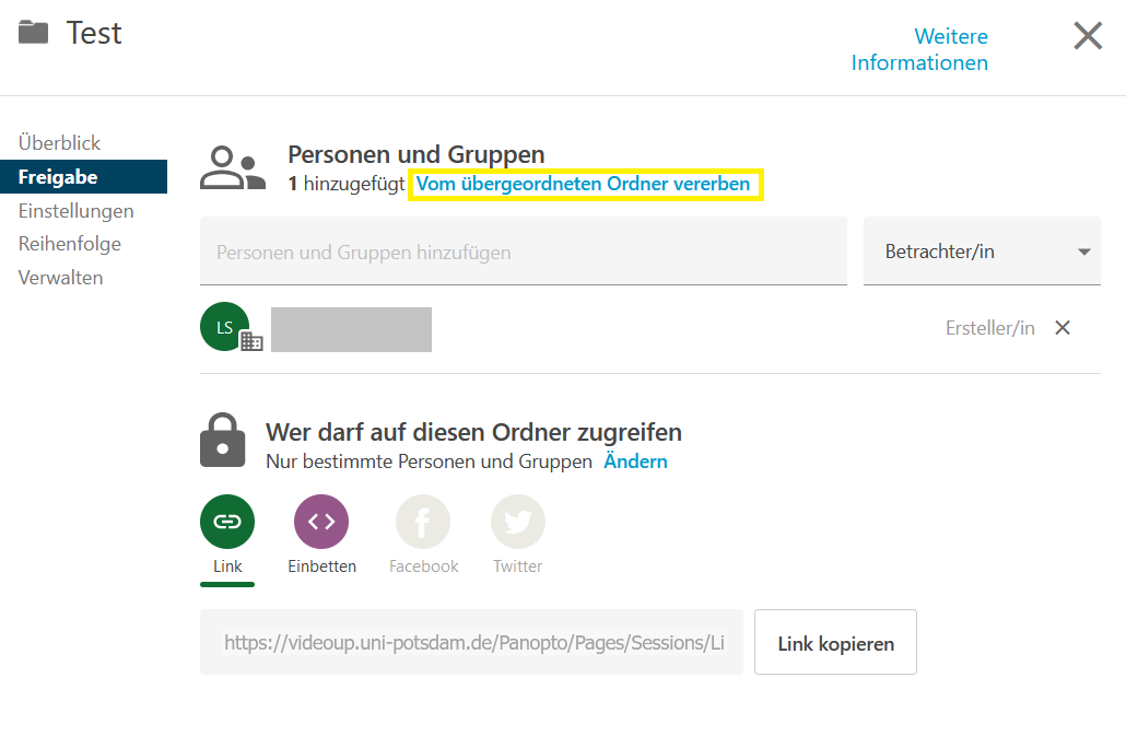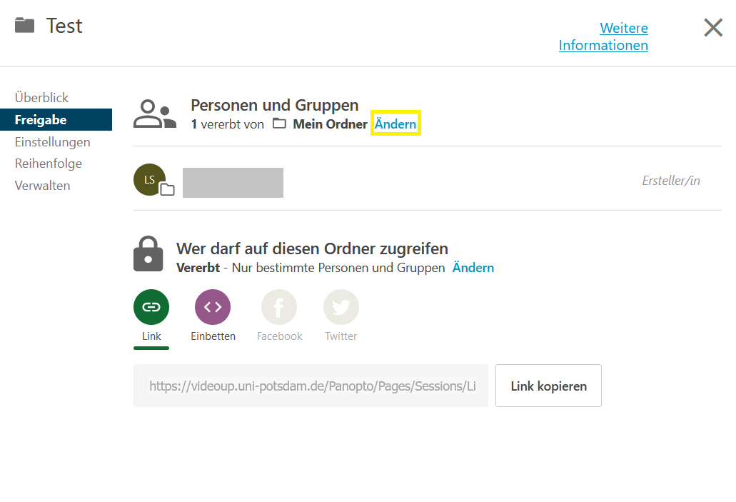 Über diesen Punkt können Sie die Freigabe Ihres Ordners und die darin befindlichen Inhalte steuern sowie festlegen, mit welchem Personenkreis dieser geteilt werden soll (wenn nicht "Mein Ordner").