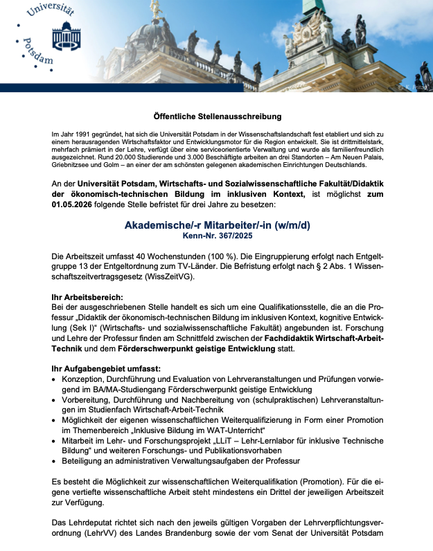 Suchen Sie nach einer beruflichen Herausforderung und haben Sie Lust, am Schnittfeld zwischen WAT und Förderpädagogik zu promovieren? Wir suchen nach personeller Verstärkung für das Team Wirtschaft-Arbeit-Technik und Förderpädagogik. Mit der 100% Qualifikationsstelle übernehmen Sie vor allem Lehre im Bereich des Förderschwerpunktes Geistige Entwicklung (4 SWS), unterstützen im LLiT – Lehr-Lernlabor für inklusive Technische Bildung und haben Zeit für das Verfassen Ihrer zukünftigen Doktorarbeit. Wenn Sie ein einschlägiges Lehramtsstudium im Fach WAT oder ähnlichen Fächern absolviert haben und Interesse an dem Schnittfeld Förderpädagogik und WAT, bewerben Sie sich bis zum 15.11. Ausführliche Informationen und die gesamte Stellenausschreibung finden Sie hier. Bei Rückfragen wenden Sie sich gerne an Prof. Dr. Isabelle Penning.