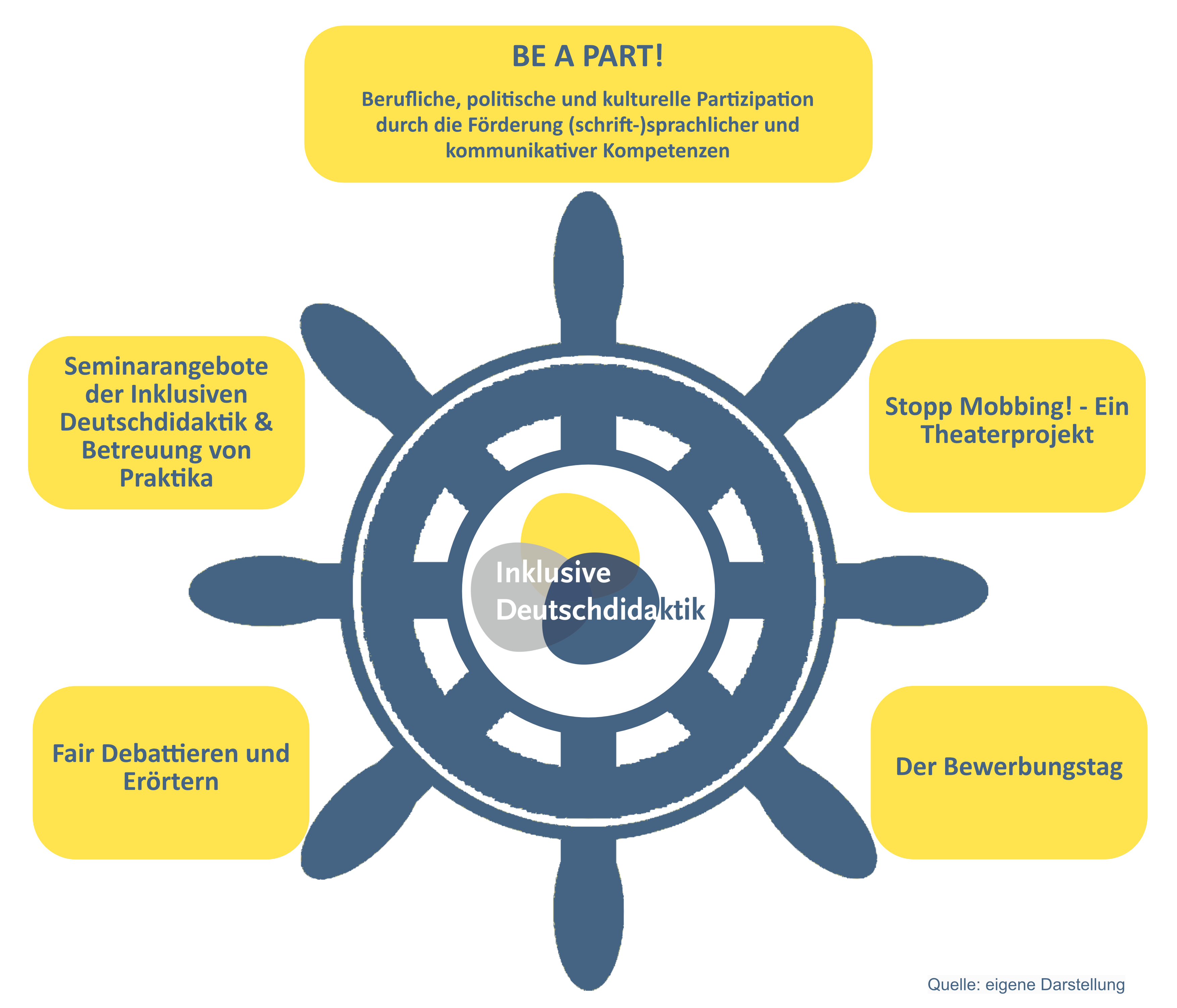 Im Rahmen des Netzwerks „BE A PART! Berufliche, politische und kulturelle Partizipation durch die Förderung (schrift-)sprachlicher und kommunikativer Kompetenzen“ der Juniorprofessur Deutschdidaktik im inklusiven Kontext/Förderschwerpunkt Sprache und Kommunikation wird bis 2027 gemeinsam mit Lehrkräften und Lehramtsstudierenden der Fragestellung nachgegangen, wie sprachliche und kommunikative Fähigkeiten in kulturellen/politischen/berufsorientierten Schulprojekten mit Schüler:innen (mit und ohne sprachlichen Förderbedarf) gefördert werden können. Mithilfe empirisch evaluierter Unterrichtsprojekte sollen im Sinne der Inklusion alle Schüler:innen kulturell, politisch und beruflich partizipieren können und somit ein wertvoller Teil der Gesellschaft sein. Die Erreichung jener Zielsetzung erfolgt konkret im Rahmen der Durchführung der folgenden drei praxisorientierten Forschungsprojekte: