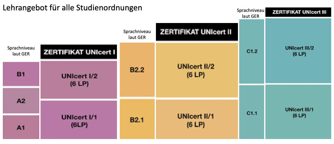 B2.1: UNIcert II/1 (6 LP) und B2.2: UNIcert II/2 (6 LP) entsprechen der Sprachpraxis 1 (9 LP)