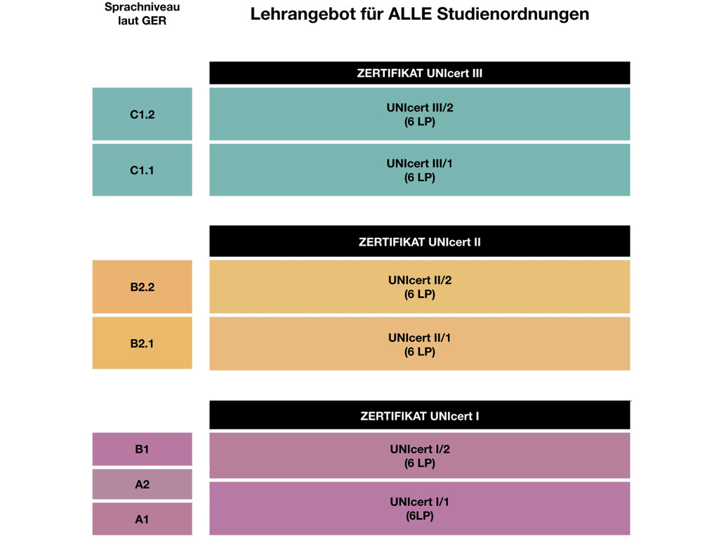 Die Tabelle zeigt die Übersicht der Lernangebote für die Zertikate UNIcert I, II und III.